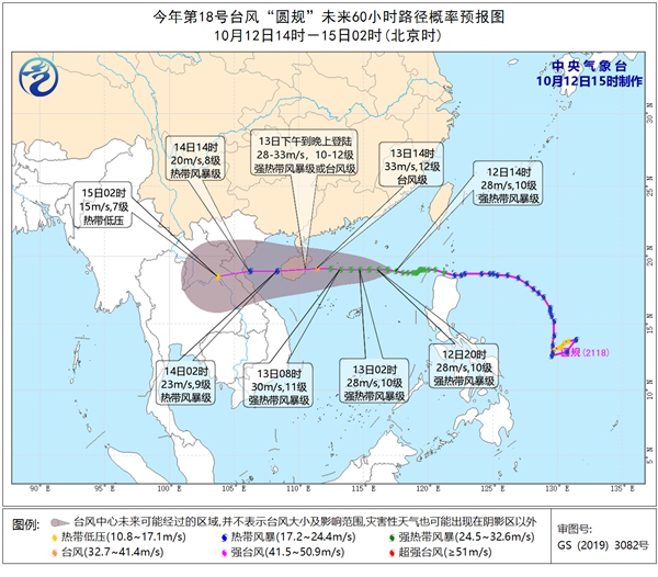 中央气象台预计,“圆规”将以每小时25-30公里的速度向偏西方向移动,强度还将有所加强,登陆后强度为台风级(12-13级,33-40米/秒)。后续,“圆规”强度会逐渐减弱,穿过海南岛,10月14日凌晨移入北部湾,然后趋向越南北部。