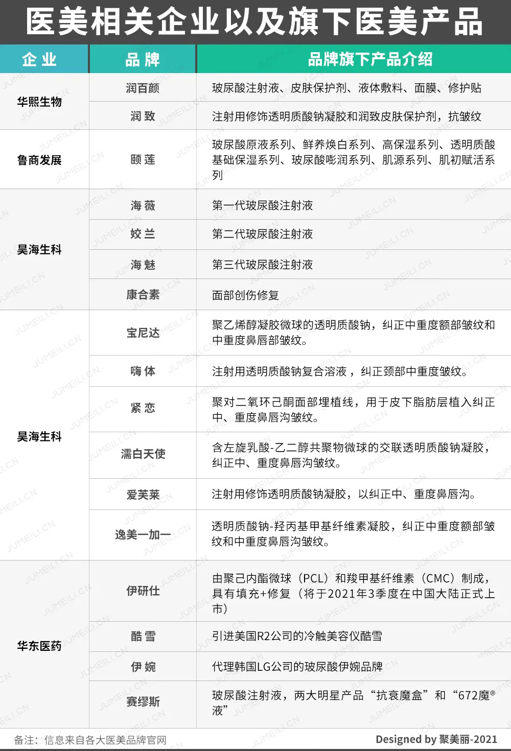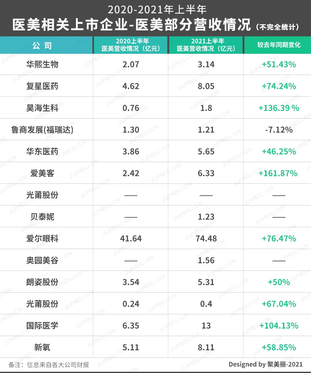 对医美行业产业链有了认识后,聚美丽梳理了截止今年上半年医美上市企业在医美方面的营收情况以及各大企业旗下的医美品牌。