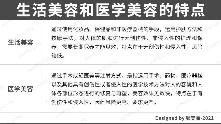 医美:医美指的是“医学美容",就是指运用手术、药物、医疗器械以及其他具有创伤性或者侵入性的医学技术方法对人的容貌和人体各部位形态进行的修复与再塑的,都属于医疗美容范畴。