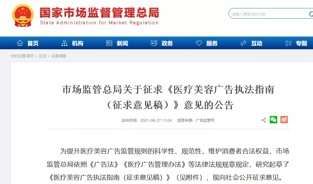 市场的火热伴随着一定的乱象,8月27日,国家市场监督管理总局网站就《医疗美容广告执法指南(征求意见稿)》发布征求意见,其中指出,将重点打击制造容貌焦虑的医美广告问题。