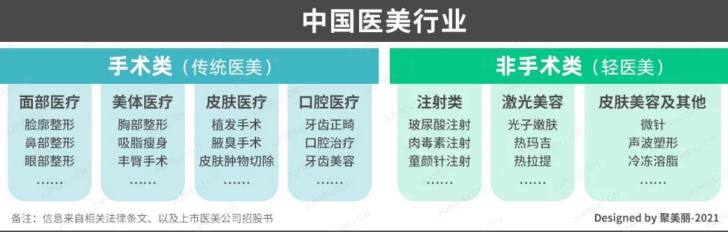 医美项目按照是否需要手术,可以划分为手术类、非手术类(又称轻医美)两个大类。顾名思义,手术就是要动刀的,丰胸、抽纸、隆鼻、削骨都属于手术类。非手术类则更多的被称为是“轻医美”,有着创伤小、风险低、价格低、恢复快等特点,与此同时相较于贵价美妆护肤类产品,轻医美的价格并没有高出许多,却更加立竿见影,也更加效果拔群。