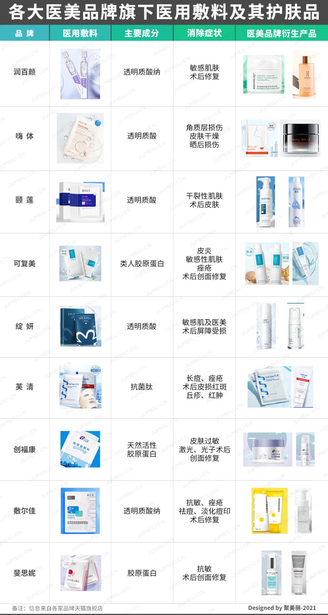 以上品牌都是正规医美品牌,它们通常带有械字号来区别于普通妆字编号,械字号代表着这个是属于医疗器械用品,不添加任何激素、抗生素、重金属以及其他易引起皮肤反应的化学制剂,主打医美手术恢复效果。同时围绕着械字号医用敷料,衍生出一系列护肤产品,形成品牌产品矩阵,上图中几大上游医美企业的护肤品牌在天猫渠道都取得了不错的销量。