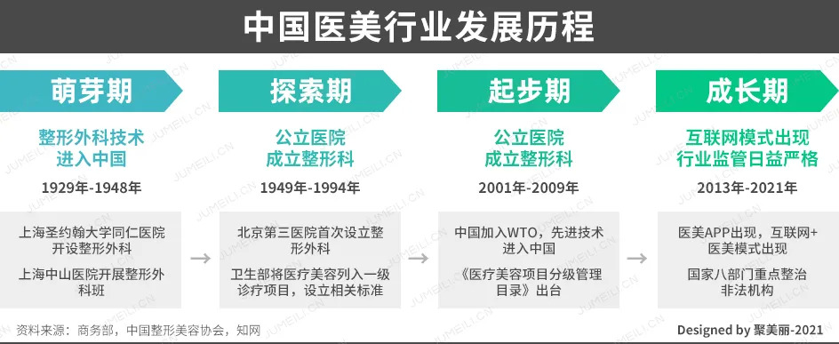 中国医美行业起步较晚,自诞生以来大体经历萌芽期、探索期、起步期、成长期这四个阶段。对比美日等国,中国医美起步较晚,仍处于发展早期,处于较低水平,未来仍具有很大发展空间,尤其是监管日趋严格,黑医美的消失将释放新的市场空间,这也让相关医美企业纷纷有了新动作,试图占据新的市场份额。