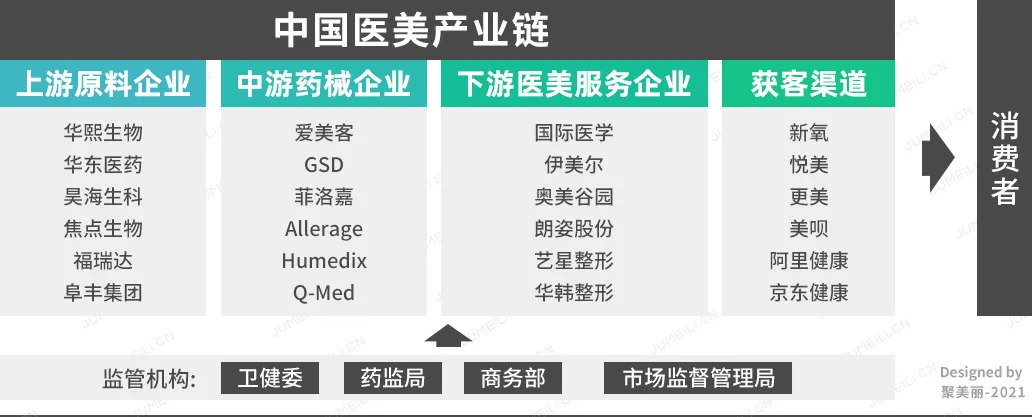 中国医美产业链上游主要包括医美原料供应商和医美器械提供商,如生产玻尿酸、A 型肉毒毒素等注射类产品以及射频、激光等皮肤设备类;中游为医疗美容产品和器械的提供商;下游包括正规机构和非正规机构,正规机构主要是指公立医院的整容科、大型连锁医美集团、中小型民营医美机构等,非正规机构是指私人诊所和美容院等。