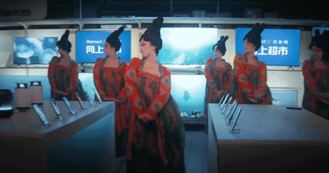 2、中秋来临之际,沃尔玛则联合郑州歌舞剧院《唐宫夜宴》推出广告片《月圆奇妙夜》,让大唐乐师们跟随着一辆购物车穿越现代,来到沃尔玛超市里,上演了一出超市奇妙夜。将品牌主张融入灵动俏皮的唐宫舞蹈,穿越剧般的场景化营销,叠加了“短剧+场景”营销势能,打破次元壁的方式,也有利于沃尔玛品牌对于年轻用户的吸引。