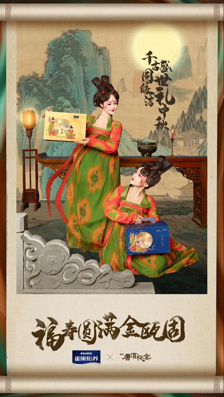 1、雀巢联动「唐宫夜宴」,以「千古同皎洁,盛世礼中秋」为主题打造中秋限定礼盒,请来节目中的唐朝美人再度亮相,呈现了几位灵动俏皮的丰腴少女在唐宫中打趣逗乐。礼盒借助少女表演展现了「月下祈福」「蟾宫折桂」「花灯盛会」的中秋习俗,总体上很契合中秋的节日氛围,也复古有新意。