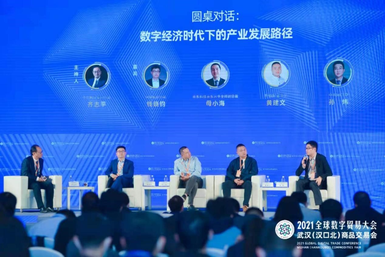 圆桌论坛环节,大会执行承办方卓尔智联集团总裁齐志平作为主持人,与国联股份总裁钱晓钧、京东科技京东云事业群副总裁母小海、中农网CEO 孙炜以及世佰跑董事长黄建文4位企业家代表,以“数字经济时代下的产业发展路径”为主题展开深入交流,论道数字经济时代传统产业高质量发展途径,探讨传统贸易向数字贸易转型升级的经验和路径。