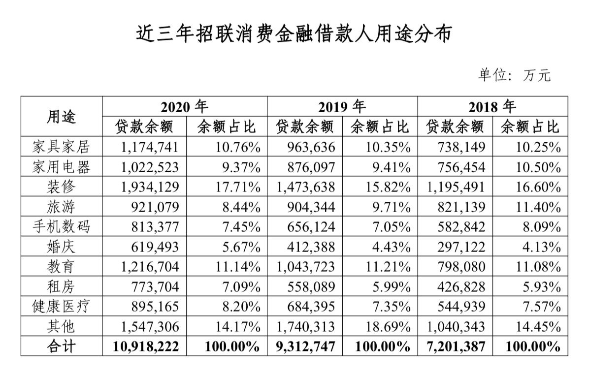 装修、家具家居和教育是招联消费金融消费信贷的主要场景,占比分别为17.71%、10.76%和11.14%。