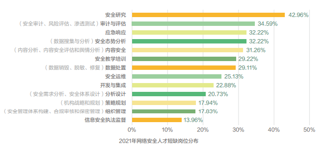 具体到岗位上,熟悉各种防御技术的安全研究岗位人才最为短缺,认为这一岗位人才短缺的人数占调查总人数的42.96%。其次是审计与评估、应急响应、安全态势分析、内容安全等技术岗位,均有超30%的从业者认为符合岗位职能的人才仍有所欠缺。