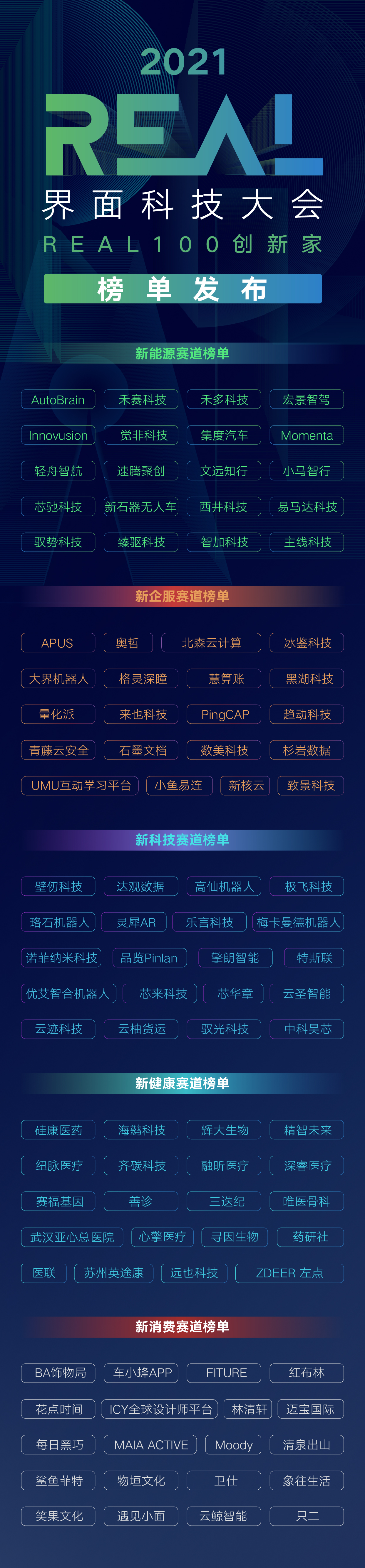 10月13日,在北京举办的界面REAL科技大会上,界面新闻发布了2021“REAL 100创新家”榜单。在四个月时间内,界面新闻联合50余家顶级投资机构,从数百家入围公司中,最终评选出覆盖新科技、新消费、新能源、新企服、新健康五大赛道的100家优秀创业公司。