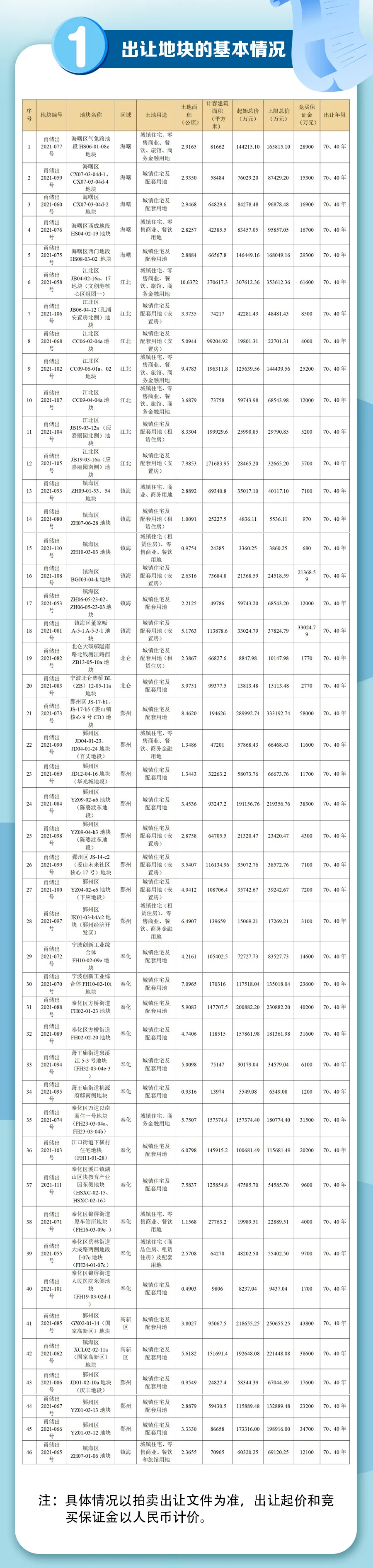 刚刚,宁波市自然资源和规划局发布了宁波第二批集中供地计划。本批次共推出46宗宅地,采用拍卖方式出让,购地资金需为自有资金,溢价率不超过15%,当土地竞价达到上限价格时,不再接受更高报价,转为在此价格基础上通过线下摇号的方式确定竞得入选人。
