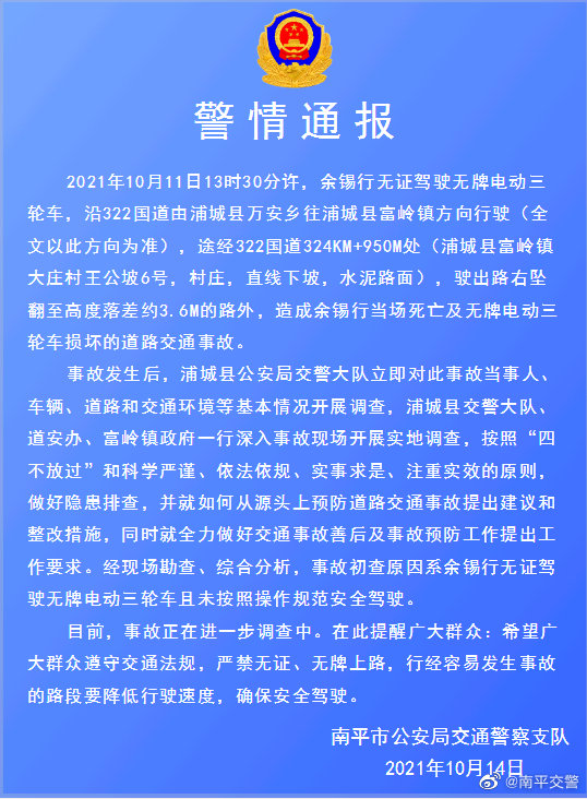 10月11日,浦城县一无牌电动三轮车在一直线下坡路面驶出路外坠翻,驾驶员当场死亡。经综合分析,事故初查原因系驾驶员无证驾驶无牌电动三轮车且未按照操作规范安全驾驶。