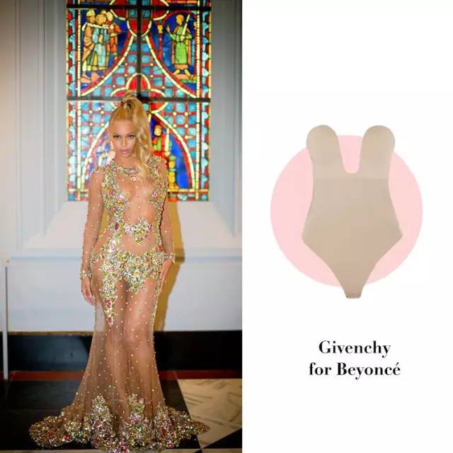 Beyoncé 在去年 Met Gala 上穿的全透视礼服,你以为她真空上阵?太天真!Givenchy 的设计师 Riccardo Tisci 帮她做了一件隐形 Bra,和她肤色一样,也是大 U 型设计。