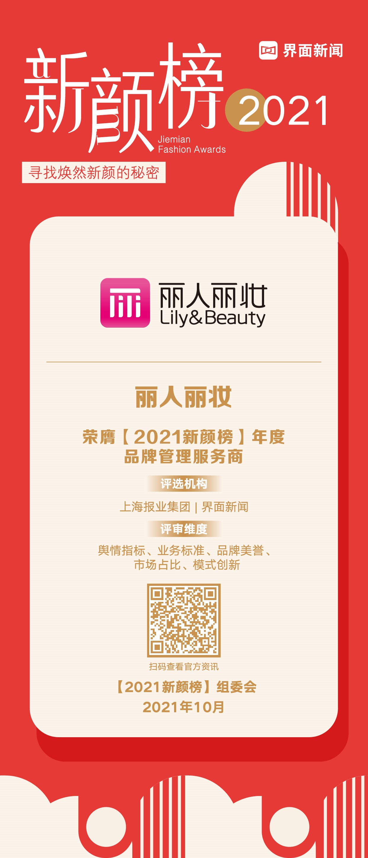 10月14日,上海报业集团|界面新闻在上海中心J酒店举办了2021【In势榜】颁奖典礼。国内时尚行业领军者共聚盛会,聚焦时尚产业趋势,挖掘时尚生态特点。集结知名供应链、品牌专家,力邀行业头部企业和时尚KOL参与盛典,共同探讨新消费时代带给美妆个护品牌的机遇与挑战。丽人丽妆凭借领先的零售网络,赢得颇具实力的品牌形象与市场地位,荣膺“年度品牌管理服务商”大奖。
