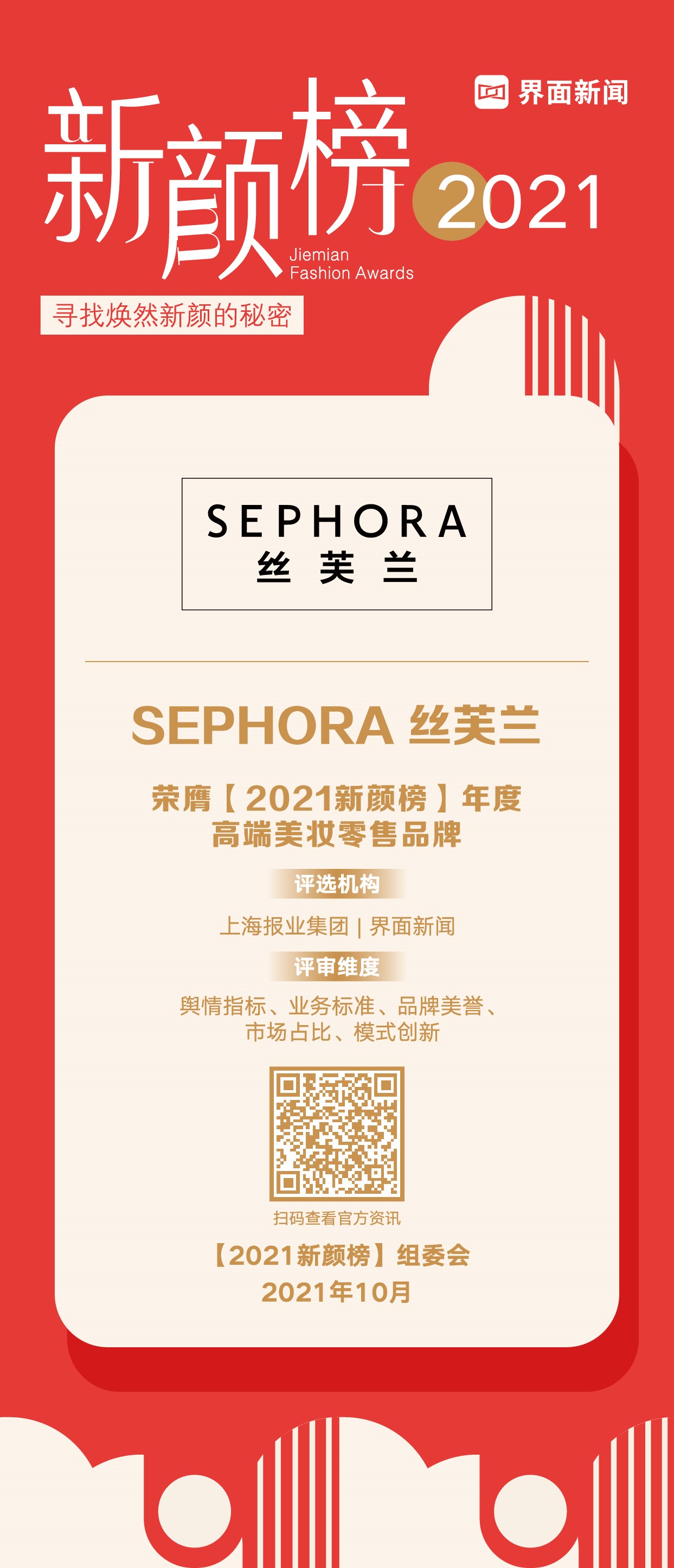 10月14日,上海报业集团|界面新闻在上海中心J酒店举办了2021【In势榜】颁奖典礼。国内时尚行业领军者共聚盛会,聚焦时尚产业趋势,挖掘时尚生态特点。集结知名供应链、品牌专家,力邀行业头部企业和时尚KOL参与盛典,共同探讨新消费时代带给美妆个护品牌的机遇与挑战。SEPHORA丝芙兰以高质量的美容服务,为数以百万计的中国顾客带来高质量的美力体验,荣膺年度品牌。