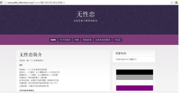 在超过8 万人注册的AVEN上,几个大字映入眼帘——“无性恋者指无法感受到性吸引力的人”,因此无性恋的“性”指的是性吸引力,而不是指性别。