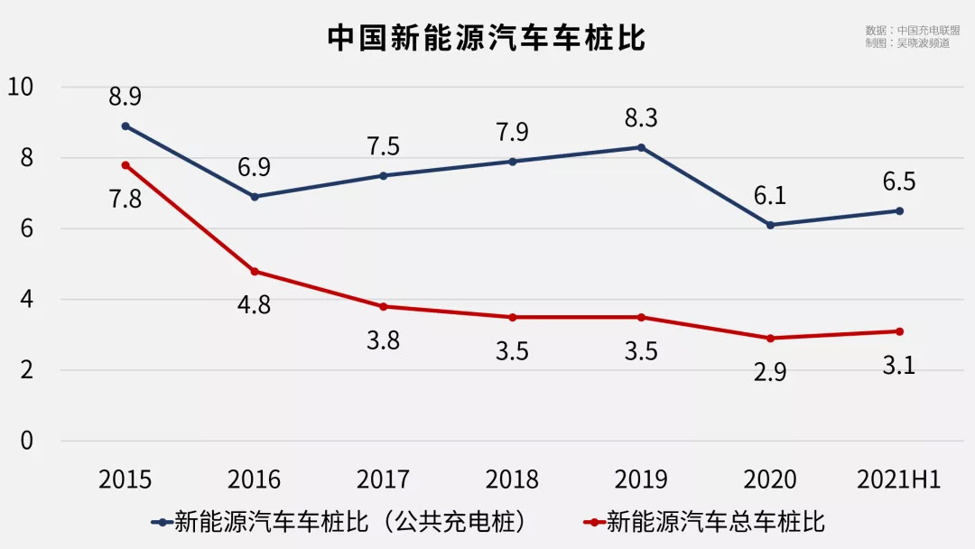 以公共充电桩来计算,车桩比从去年底的6.1:1升至6.5:1,平均每个公共桩对应6—7辆车。