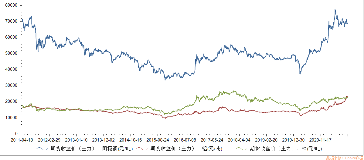从下面的图像可以看出,大宗商品中的铜、铝、锌的期货价格都来到了近十年的高点,而大宗商品与生产生活存在极强的关联性,而且这些原材料的价格暴涨后,会传导到中下游,从而导致终端产品的价格上涨,进而影响物价,影响民生。