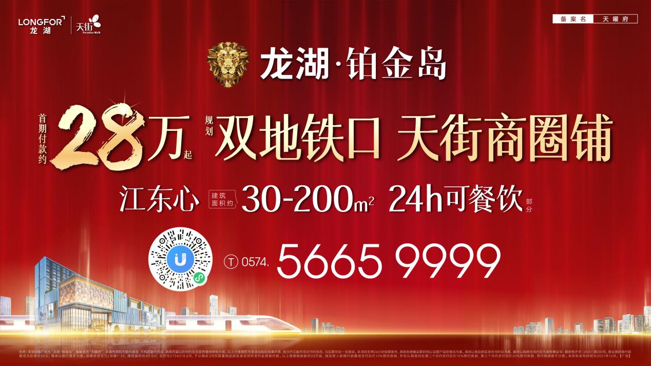免责:本项目推广名为“龙湖·铂金岛”,备案名为“天曜府”,本宣传资料为要约邀请,不构成要约内容,具体内容以合同约定及政府最终审批为准。以上示意图仅为本项目规划效果示意,图示外立面并非交付时状态,与实景存在一定差异。本项目支持24小时经营条件,具体各商铺运营时间以运营户实际情况为准。具体以商品房买卖合同约定为准,最终以购房合同约定为准预售证号:鄞房预许字(2020)第030号。商业用房首付款最低为总房价50%,具体以银行要求为准。该套房源号为2号楼1-38,建筑面积约40.5㎡,总价为2734219.8元,于认购后3月内签署商品房买卖合同并支付全部首付款。以上首期购房款约28万起,指买受人首期付款最低支付总价10%预付房款,并在认购签约后第二个月内支付总价10%预付房款,第三个月内支付总价30%预付房款,预付购房款不计息。本资料发布时间为2021年10月。