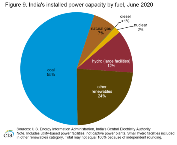 其中较具代表性的就是印度面临的能源危机。除了需求回暖、天气恶劣等因素外,国际煤价的上升也是印度能源危机的一大原因。印度每年的总发电量中煤炭占比50%以上。印度虽然是产煤大国,但煤炭产量跟不上需求,一定程度上依赖进口。2019年,印度进口了2.5亿吨煤炭,是全球第二大煤炭进口国。结果在本次能源危机中,煤价上升使印度煤电厂的煤炭库存平均只能维持4天,处在全国大停电的边缘。