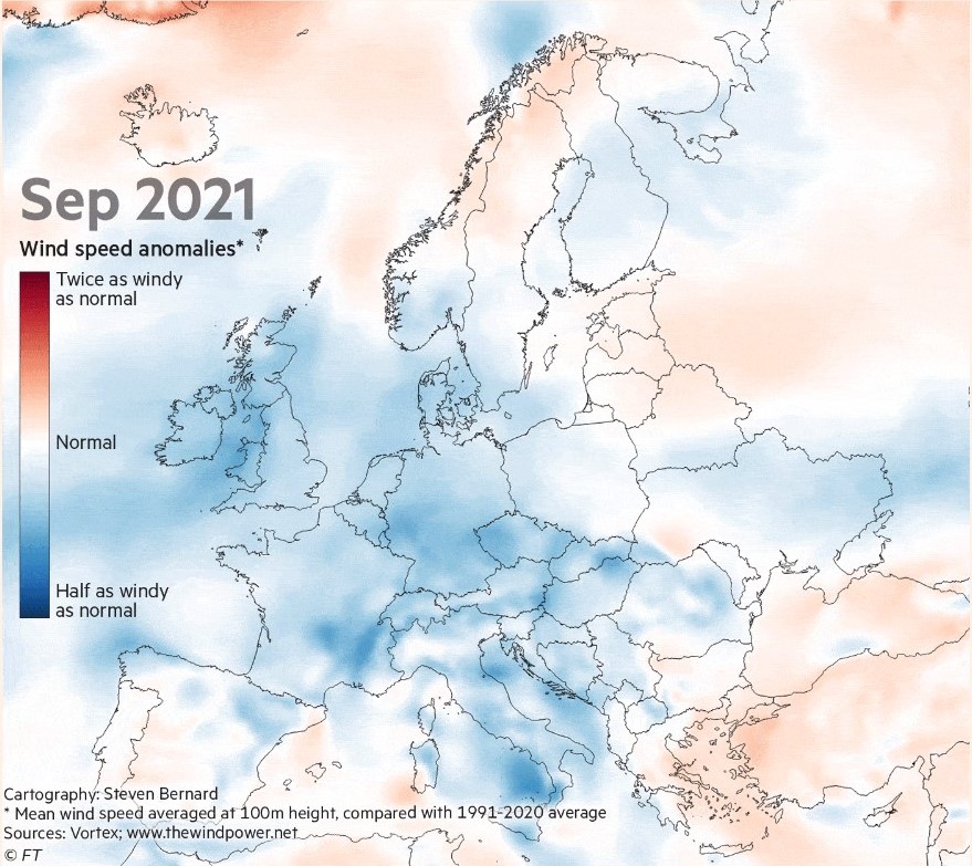 进入9月以来,全球能源价格涨幅突增,极端天气导致能源产量下降是一个重要原因。风电、水电、太阳能等可再生能源高度依赖天气状况。随着全球能源结构逐渐向可再生能源倾斜,能源供给也更加依赖合适的天气。近期多地的气候条件对可再生能源的生产造成了极其不利的影响,导致今年年初以来的全球能源价格上涨趋势进一步加速。