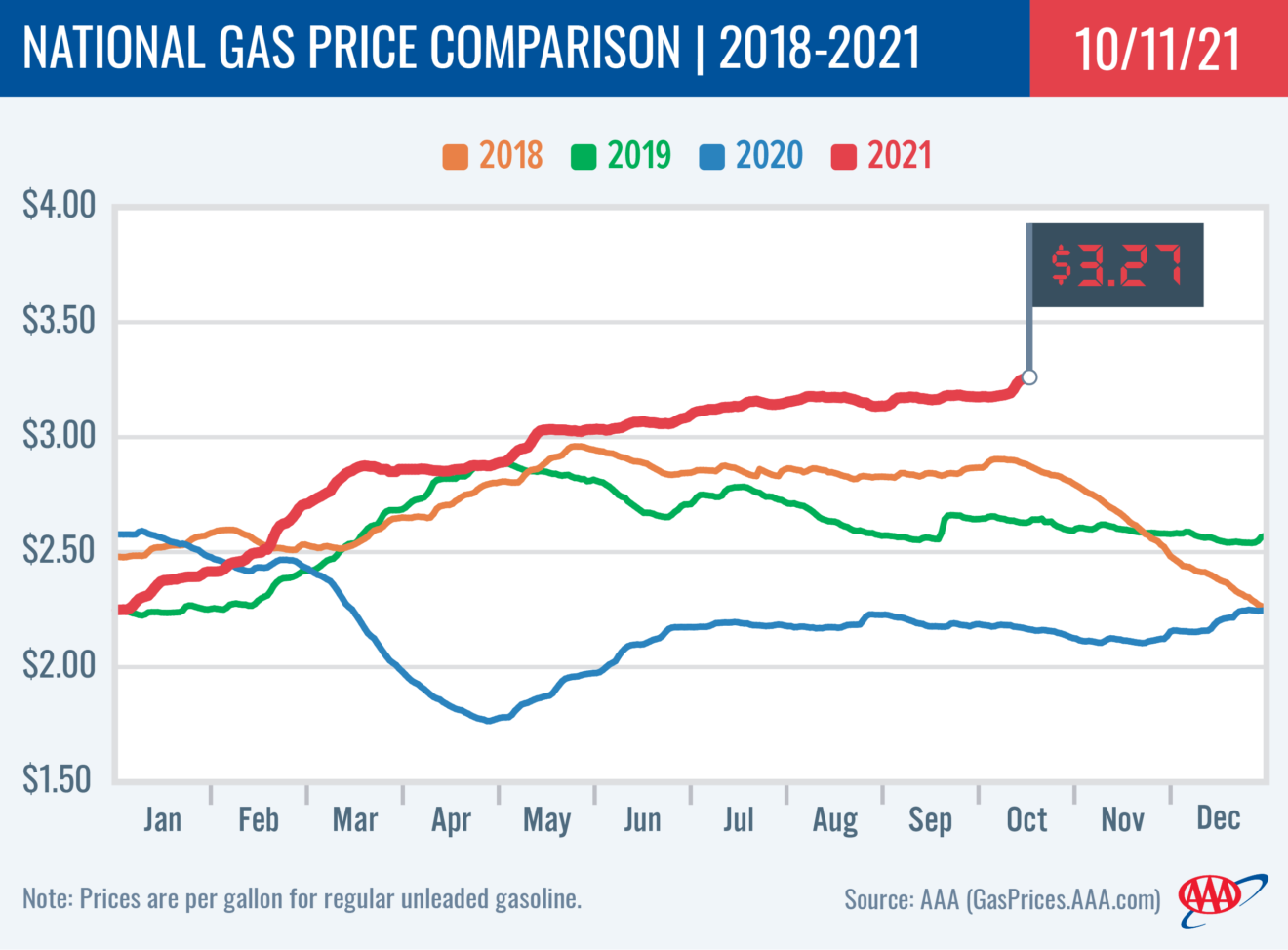 天然气价格的上涨也并不仅仅影响高度依赖天然气的国家。虽然不同国家的能源结构有很大差异,但能源价格会通过经济学上的“替代效应”从一种能源传导至另外一种能源。比如欧洲天然气价格暴涨,折合成石油价格相当于每桶200美元以上。一些产业中原本因成本过高而不愿使用的石油,相比之下此时却成为更加便宜的能源。由此助推的油价上涨传导到了大西洋彼岸的美国。WTI原油价格今年10月一度突破80美元,创7年来新高。而美国消费者面临的汽油价格也水涨船高,10月11日已达到每加仑3.27美元,比去年同期上涨超过50%。