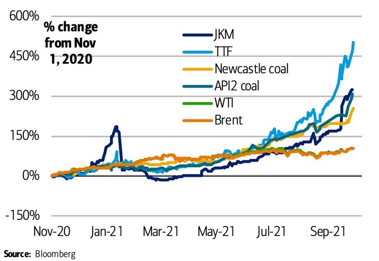 高盛大宗商品研究全球负责人杰夫·柯里(Jeff Currie)预计,随着北半球冬季来临,能源价格将保持在高位,甚至还会走高。但柯里也认为,能源价格上涨有助于加速能源转型,更高的价格会增加所有可再生能源的商业吸引力。