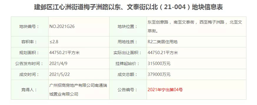5月20日,江心洲G26地块经过10轮竞价,一次性加价5.3亿元,达到最高限价。最终G26由招商、南通瑞城竞得,总价37.9亿元,楼面价30247元/㎡,毛坯限价40783元/㎡。