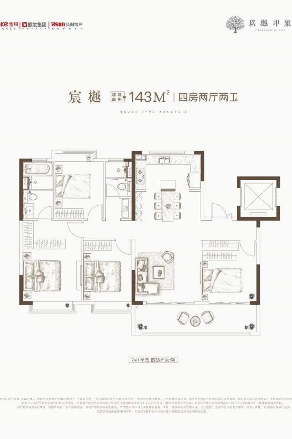 143㎡也是四室两厅两卫,四开间朝南,双阳台设计,客卫采用了干湿分离的设计。
