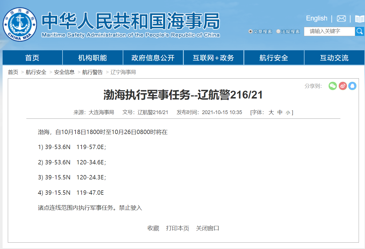 据海事局网站消息,大连海事局发布航行警告,渤海,自10月18日1800时至10月26日0800时将在1) 39-53.6N 119-57.0E;2) 39-53.6N 120-34.6E;3) 39-15.5N 120-24.3E;4) 39-15.5N 119-47.0E诸点连线范围内执行军事任务。禁止驶入。