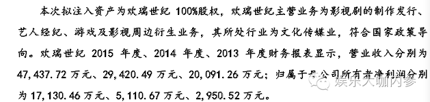 但对比借壳泰亚股份时期,欢瑞世纪此次借壳显得更加谨慎。在2014年与泰亚股份的重组方案中,欢瑞世纪承诺公司2015年及2016年度合并报表归属于母公司所有者的净利润分别为2.27亿元和2.95亿元。但此次借壳星美联合,欢瑞世纪却只有1.70亿元、2.41亿元的业绩承诺。