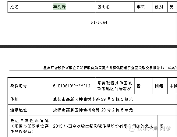 2015年4月,欢瑞世纪通过旗下欢瑞世纪(天津)资产管理合伙企业(有限合伙)(下称“天津欢瑞”)受让上海鑫以所持星美联合57,938,783股股份,占星美联合已发行总股本14%,成为星美联合第一大股东。2015年5月,借壳方案出炉。星美联合拟以7.66元/股非公开股份购买欢瑞世纪全体股东所持有的欢瑞世纪100%股权,标的资产预估值为30亿。若借壳成功,李易峰将借此进入A股市场,持有星美联合72.54万股。