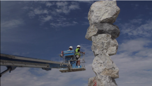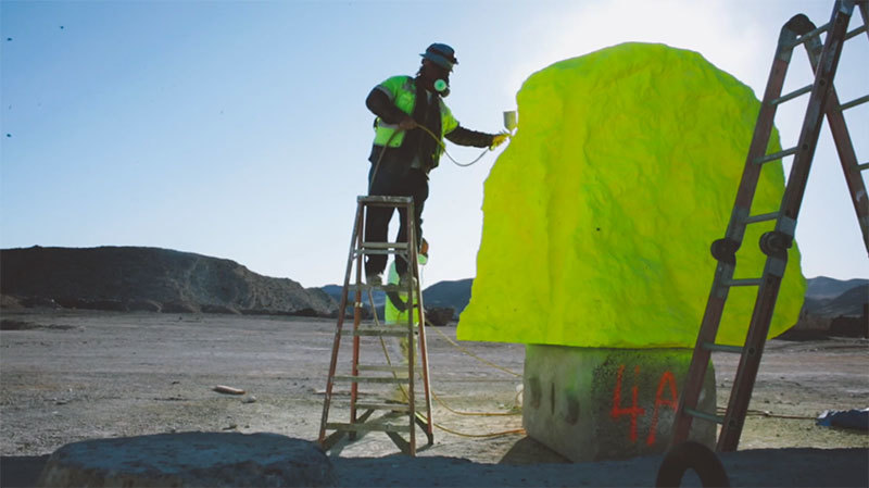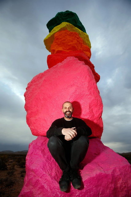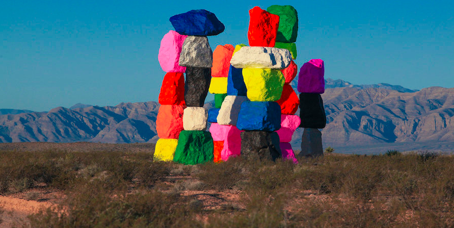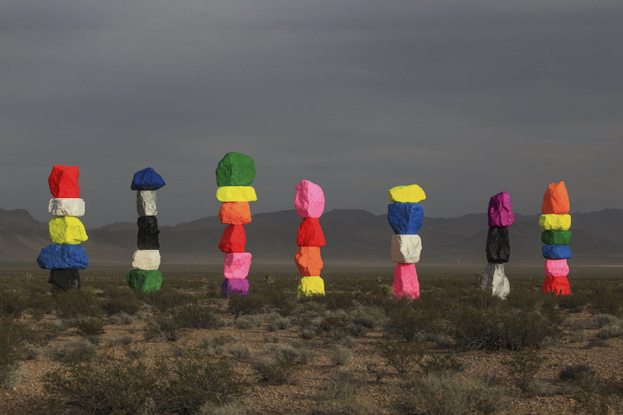 在距离拉斯维加斯不到半个小时车程的内华达沙漠边界,赌城迷乱的灯光刚刚消失在身后,遥遥的便可望见“魔力山”的彩色身影,这就是 Ugo 从立意、选材、打磨、上色到最后完成造型,整整花了五年时间完成的作品——Seven Magic Mountains。
