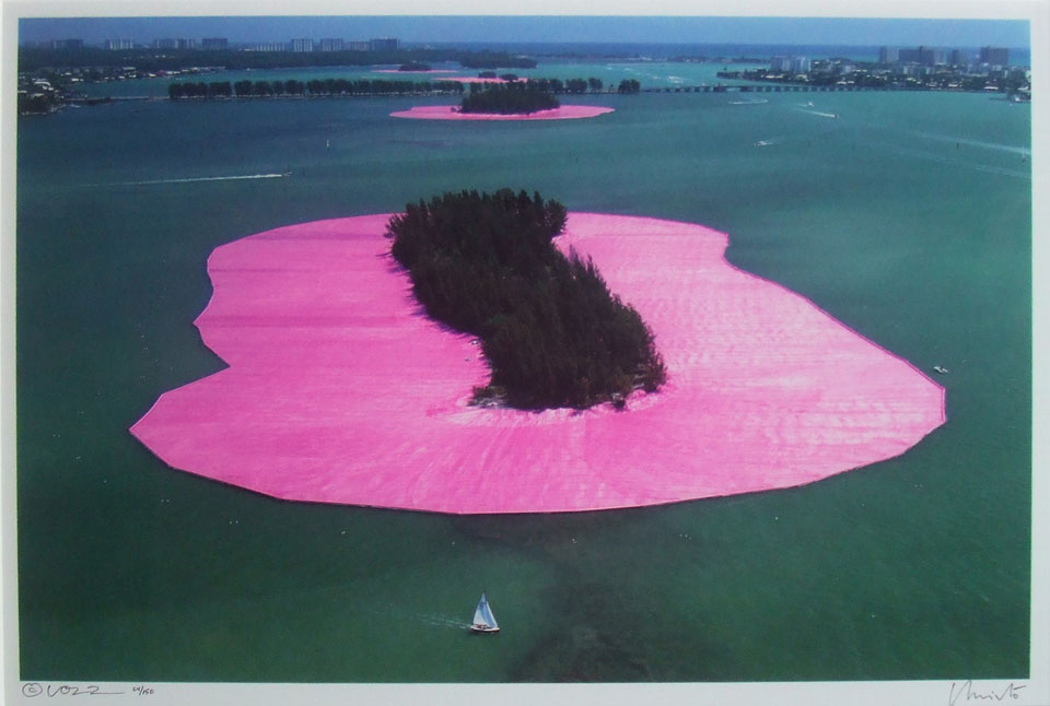 这种亲近自然的创作形式叫地景艺术,泥土、沙石、山川、河流......那些存在于大地上的一切都可以成为加工对象,无论艺术家对它们做了什么,最后它们一定又归于自然之手。这种艺术形式始于上世纪六七十年代的美国,最为人熟知的作品当属大地艺术家克里斯托夫妇联手创作的“被环绕的岛屿”: