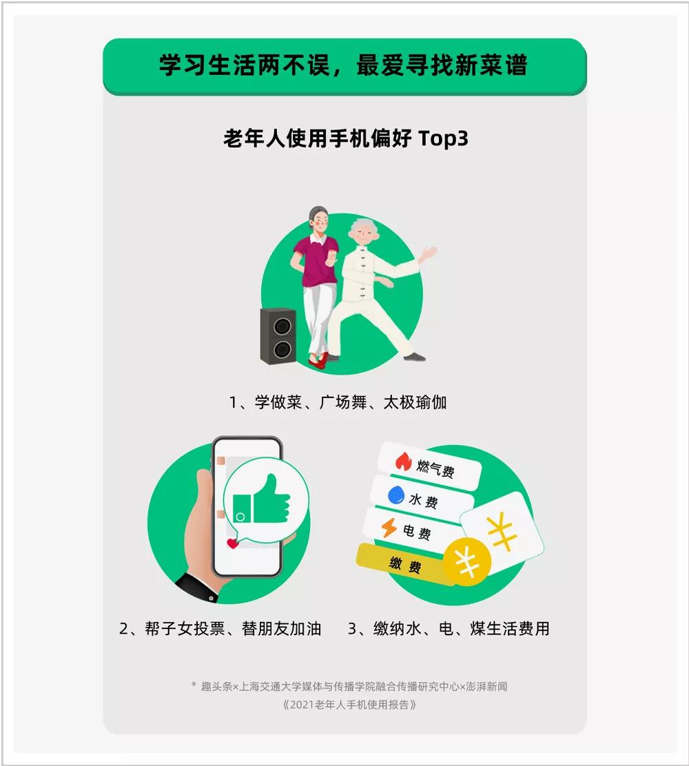 老年人用手机上网最喜欢做什么?报告显示,老年人十分热爱学习。他们通过智能手机“学做菜”、“学广场舞”、“学游泳、太极、瑜伽等运动”。