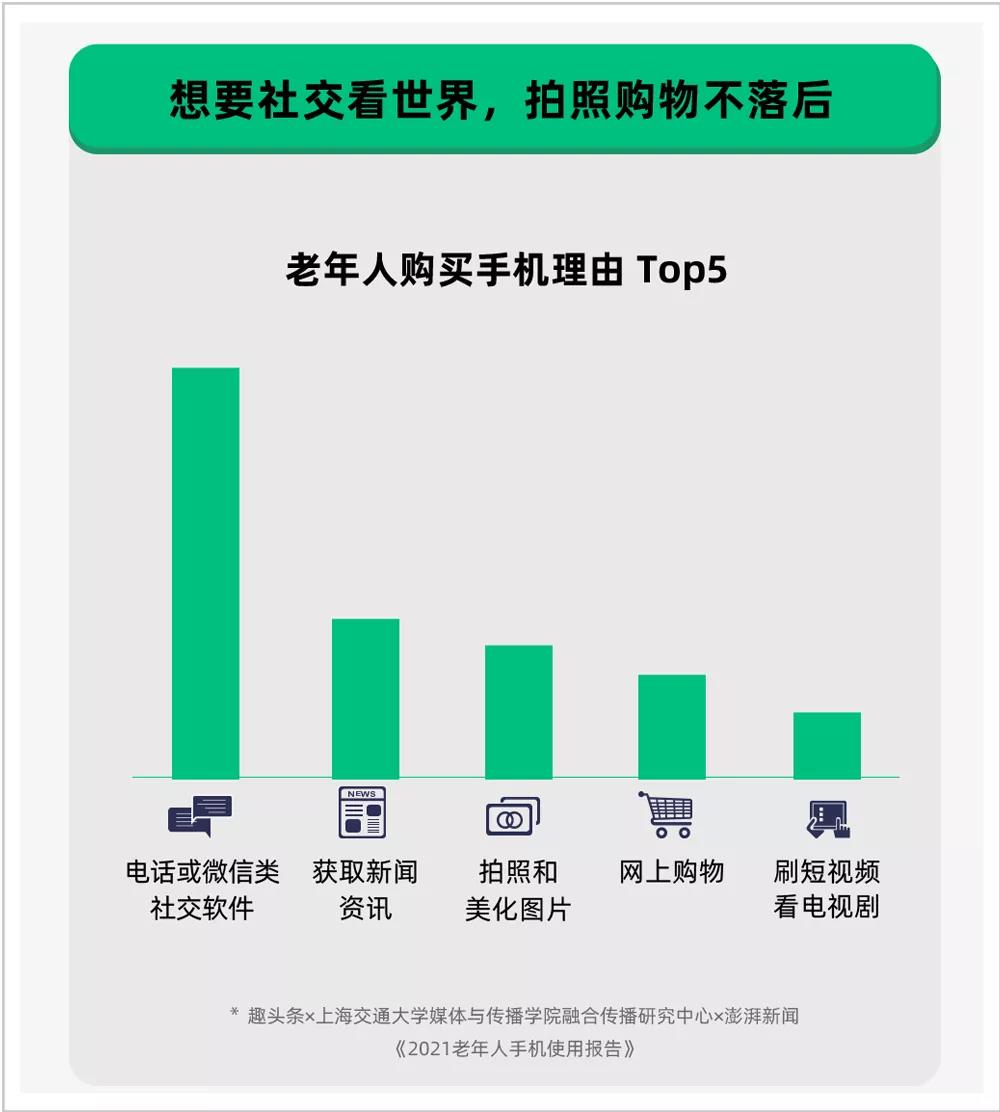 老年人群体购买智能手机的主要目的中,除了位列TOP 1的“打电话、使用微信等社交软件”,位列第二位的是“获取新闻资讯”,排第三位的是“拍照和美化图片”。