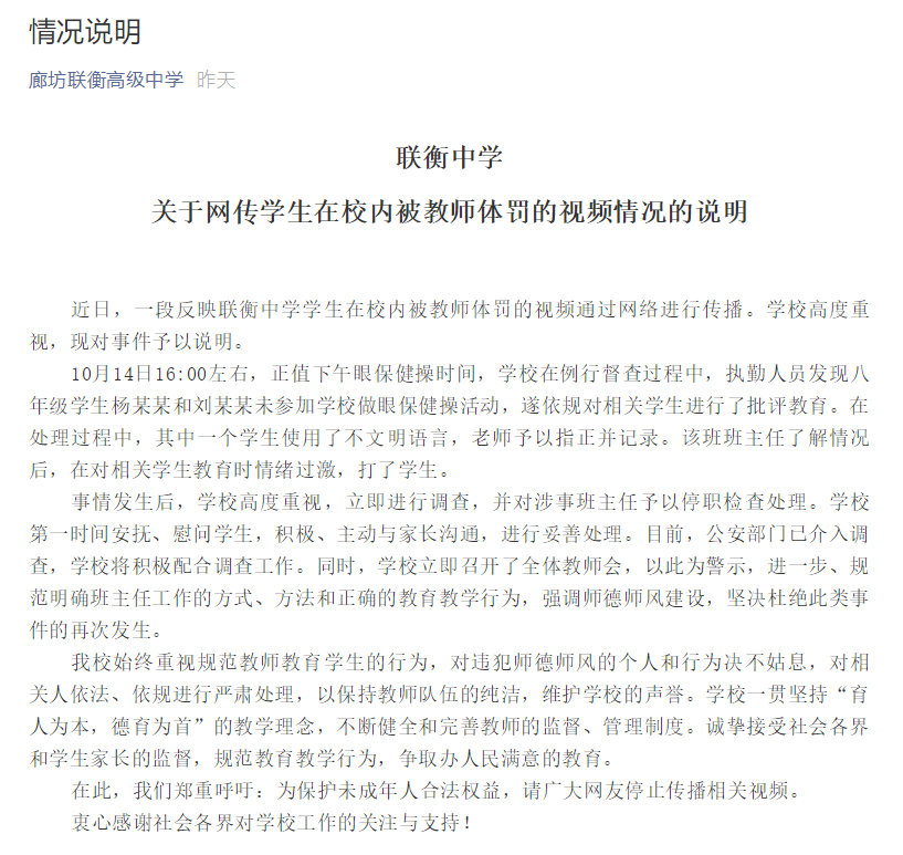 据“廊坊联衡高级中学”微信公众号消息,日前,联衡中学发布关于网传学生在校内被教师体罚的视频情况的说明。