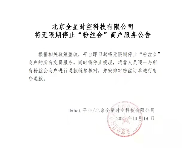 10月14日,Owhat发布公告,称根据相关政策调整,平台将无限期停止“粉丝会”商户的所有交易服务,同时将停止提现,对粉丝进行退款服务。