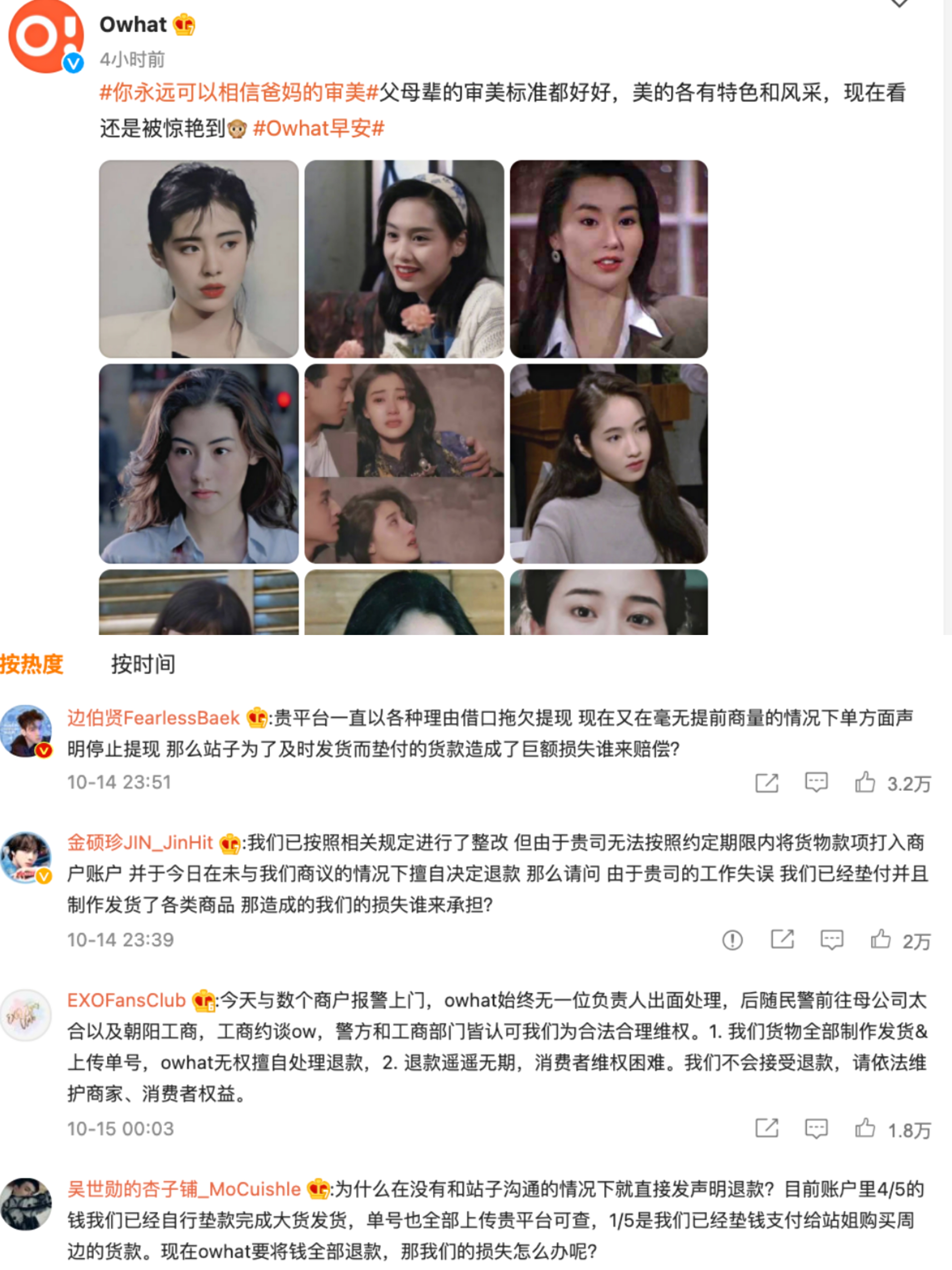 截止发稿前,针对Owhat事件不断有新的后援会和站子发布声明,各大商户和粉丝也在通过12315投诉等方法积极维权中。