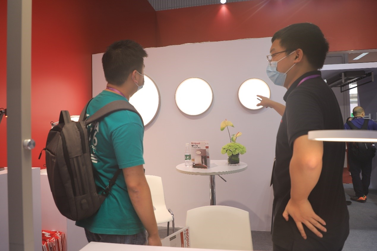 霍尼韦尔公司一位工作人员向客人介绍智能灯系列。
