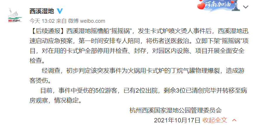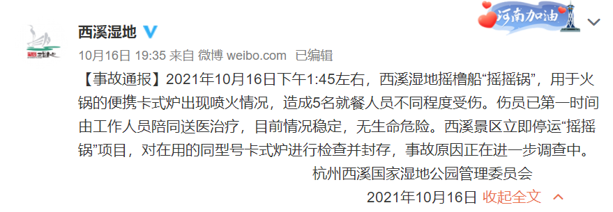 10月16日,杭州西溪国家湿地公园管理委员会发布通报称:2021年10月16日下午1:45左右,西溪湿地摇橹船“摇摇锅”,用于火锅的便携卡式炉出现喷火情况,造成5名就餐人员不同程度受伤。伤员已第一时间由工作人员陪同送医治疗,目前情况稳定,无生命危险。西溪景区立即停运“摇摇锅”项目,对在用的同型号卡式炉进行检查并封存,事故原因正在进一步调查中。