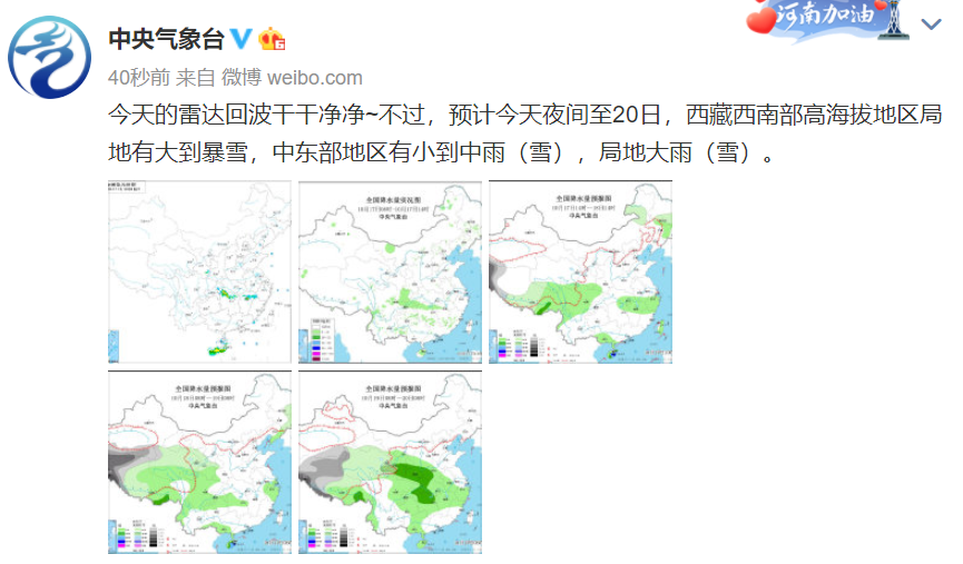 预计今天夜间至20日,西藏西南部高海拔地区局地有大到暴雪,中东部地区有小到中雨(雪),局地大雨(雪)。