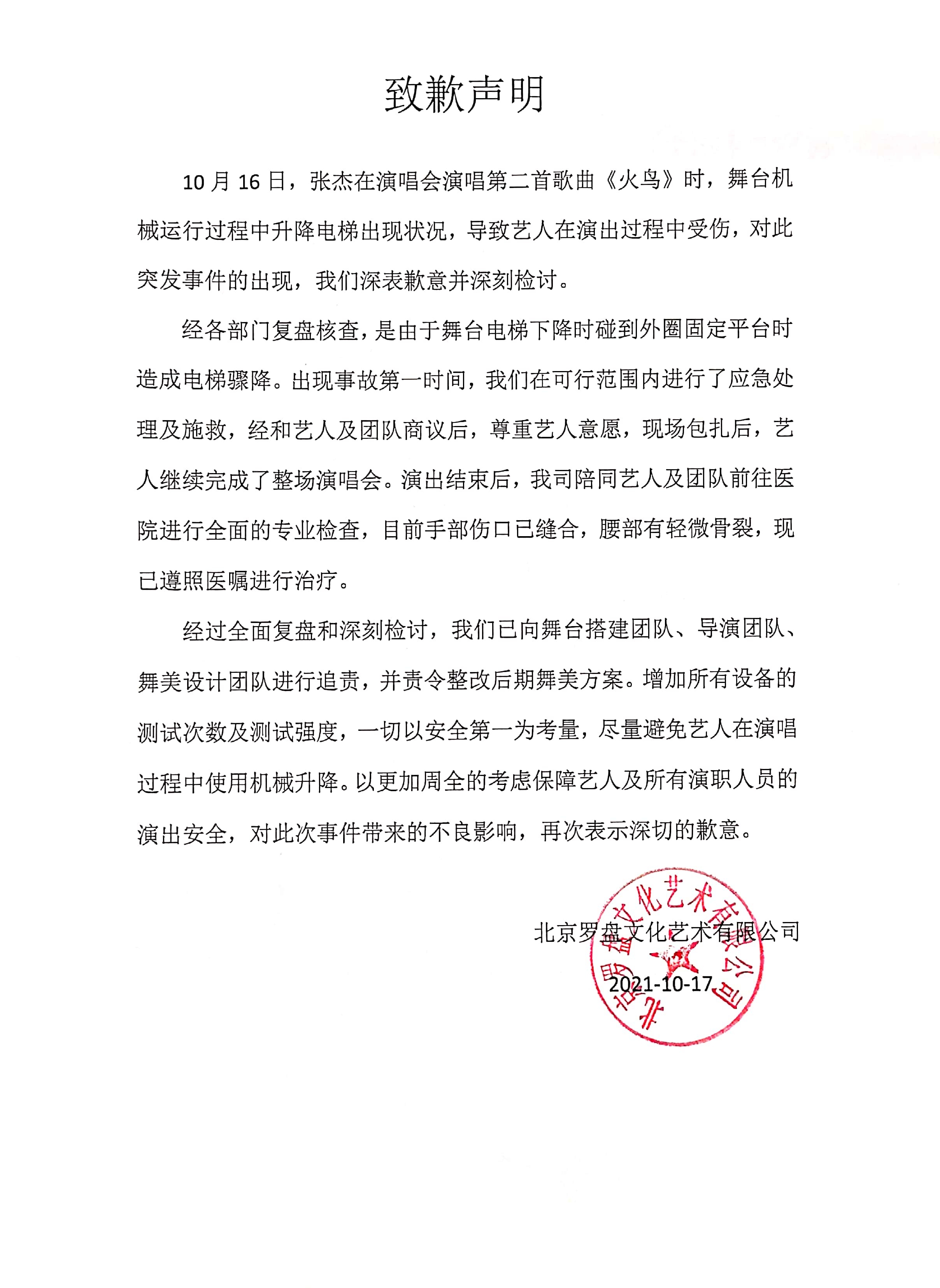 针对张杰演唱会中的突发事件,演唱会主办方罗盘文化10月17日通过其官方微博发布致歉声明称,经过全面复盘和深刻检讨,我们已向舞台搭建团队、导演团队、舞美设计团队进行追责,并责令整改后期舞美方案,“增加所有设备的测试次数及测试强度,一切以安全第一为考量,尽量避免艺人在演唱过程中使用机械升降”。