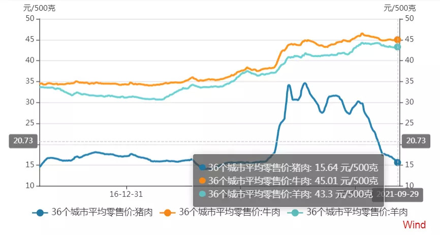 即使是在猪肉最高价格的时候,牛羊肉也远远压倒了猪肉价格,同样的蛋白质摄入量,猪肉只需要接近三分之一的成本即可完成。