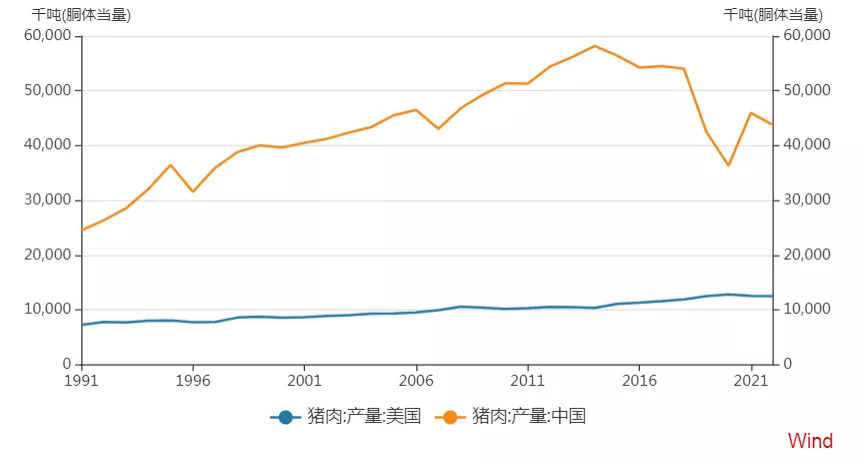有需求自然会有供应,在巨大的人口基数和稳定增长的人均消费量基础上,中国的猪肉产量迅速增长,最高峰时,中国猪肉产量接近畜牧大国美国的六倍。