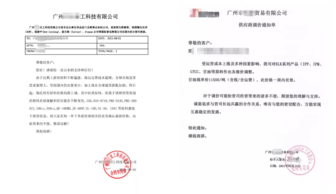 多位行业人士告诉青眼,目前几乎所有与石化相关的化妆品原料均出现了不同幅度的价格上涨,不少工厂均收到了来自上游原料供应商发布的调价函。譬如,广州一家代工厂的负责人就向青眼介绍,近期工厂收到了供应商的“调价通知单”,“有2家供应商分别表示,旗下的KLK系列产品、甘油等原料,以及陶氏所有原料价格均将上调,提醒我们在下单前要确认最新的价格。”
