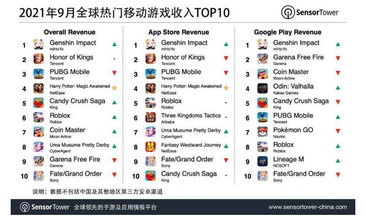 榜单前五另外三款游戏为腾讯《PUBG Mobile》(合并《和平精英》收入)、网易《哈利波特:魔法觉醒》和King《Candy Crush Saga》。