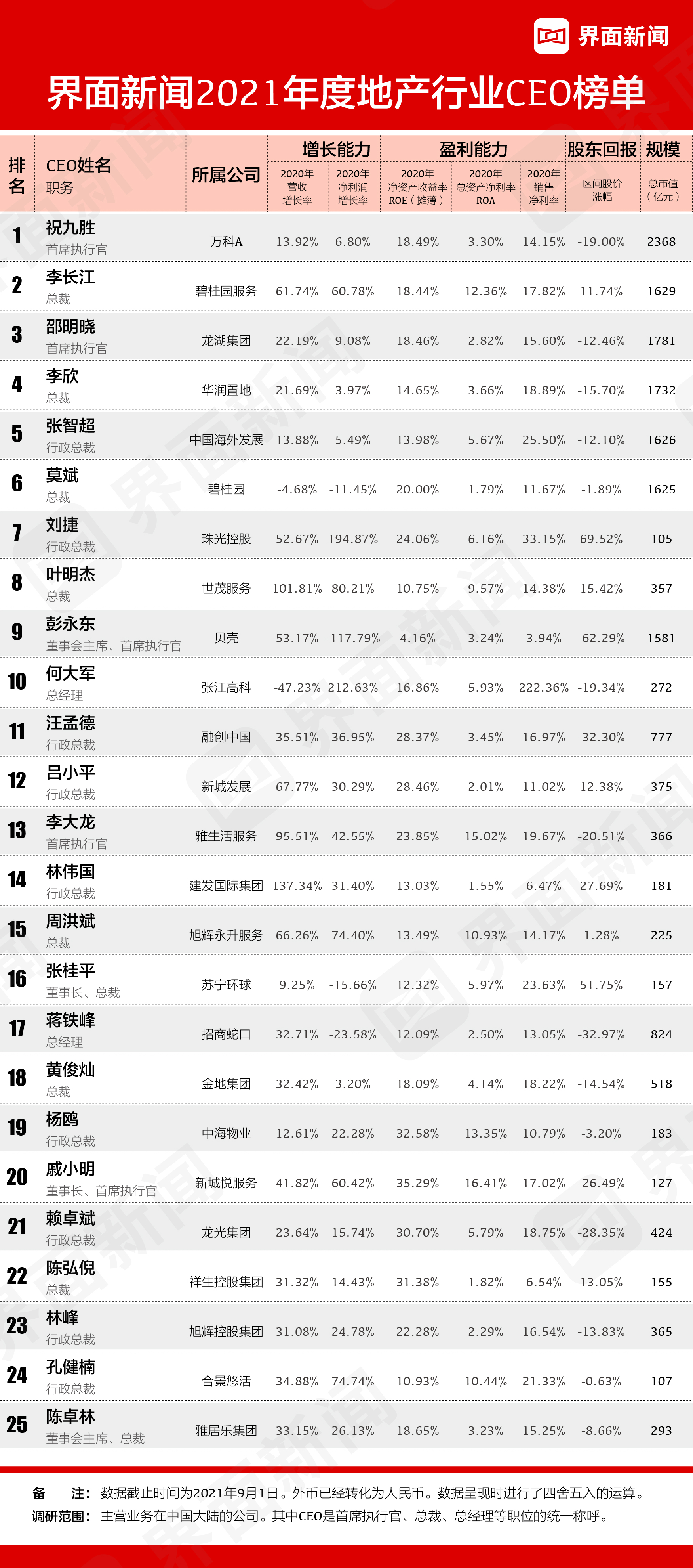 我们的研究面向中国大陆地区房地产企业的CEO,进入候选池的CEO需要同时满足(1)任期满一年且截至2021年9月1日前仍在任的CEO。(2)其公司于2020年9月1日之前上市。我们通过衡量公司财务和股市表现来评价CEO的管理能力。公司财务表现方面,我们重点关注企业成长能力(营收增长率、净利润增长率)及盈利能力(ROE、ROA等)。股市表现方面我们衡量截止日的52周股价区间涨幅,以反映最新情况。统计过程中已将外币转化为人民币计算,数据呈现时进行了四舍五入的运算。空间受限,展示出来的数据不是全部排榜数据。