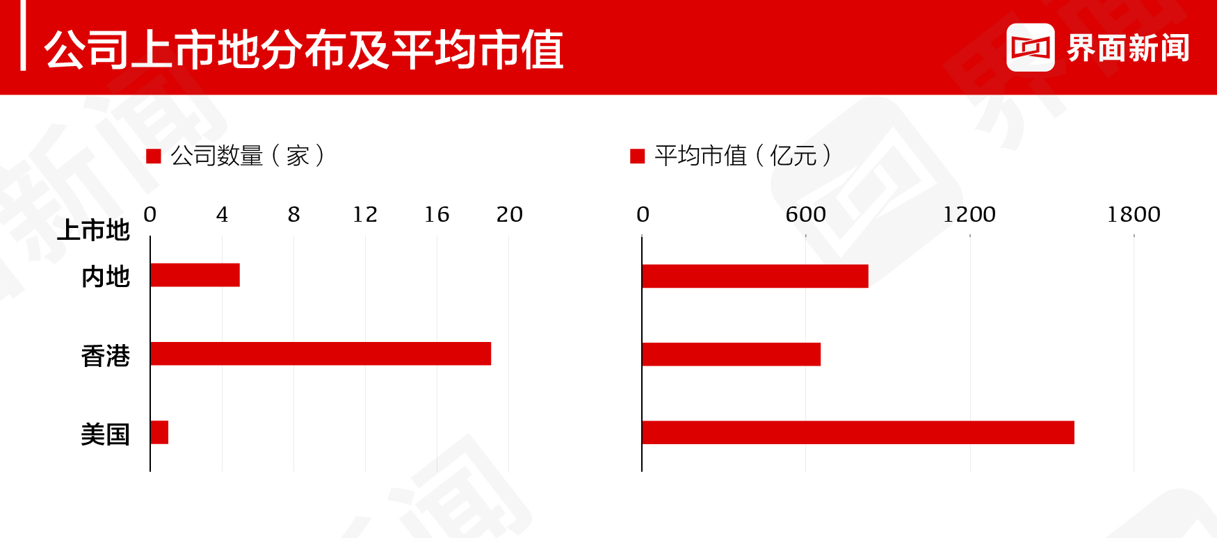 这25位CEO所在的上市公司,有5家在内地上市,平均市值828亿元;19家在香港上市,平均市值654亿元;1家在美国上市,市值1581亿元(多地上市的,以上市时间较早的为准)。