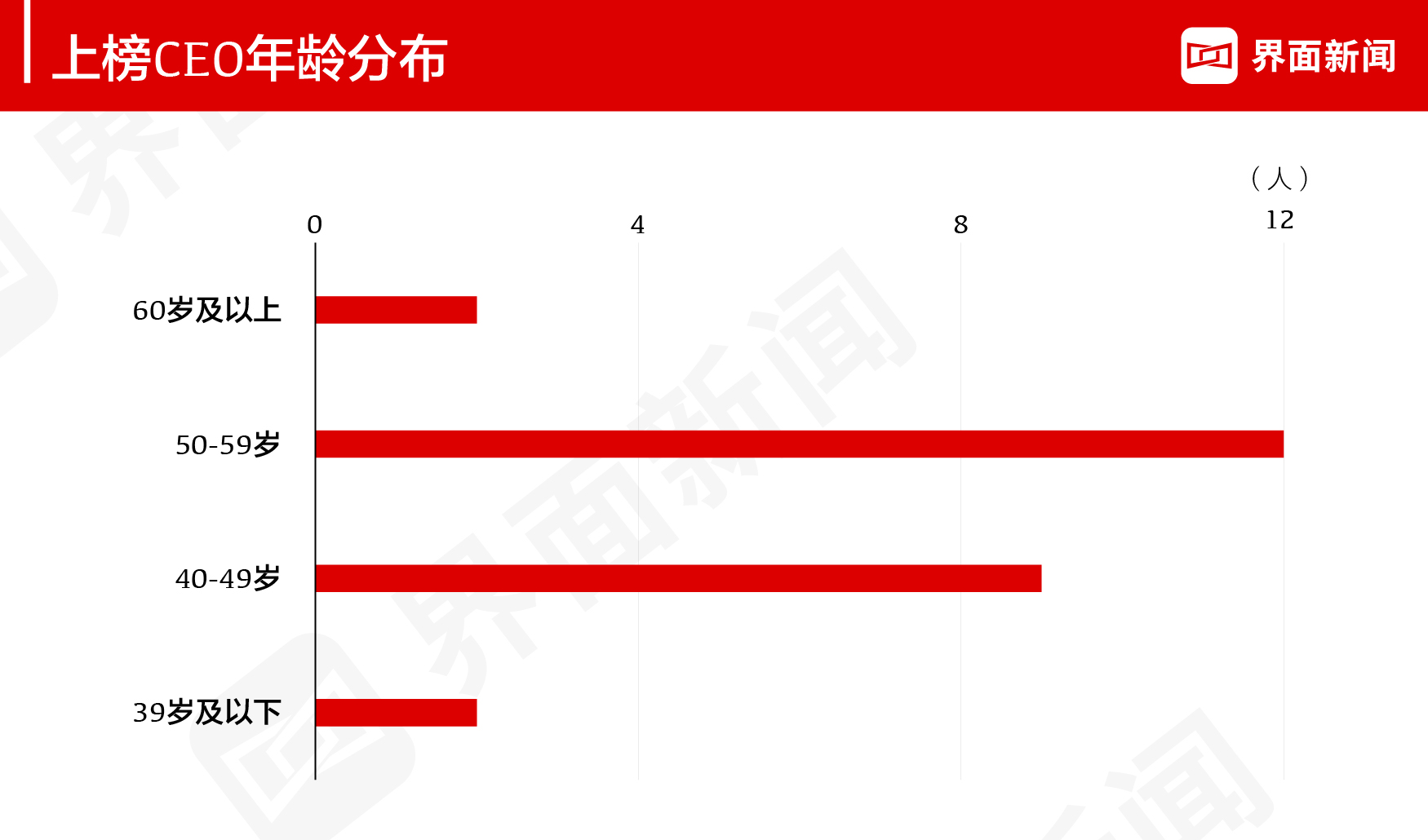 榜的25位CEO均为男性,主要集中在“不惑”与“知天命”的岁数,平均年龄50岁,其中最年轻的当属雅生活服务的李大龙,今年36岁。